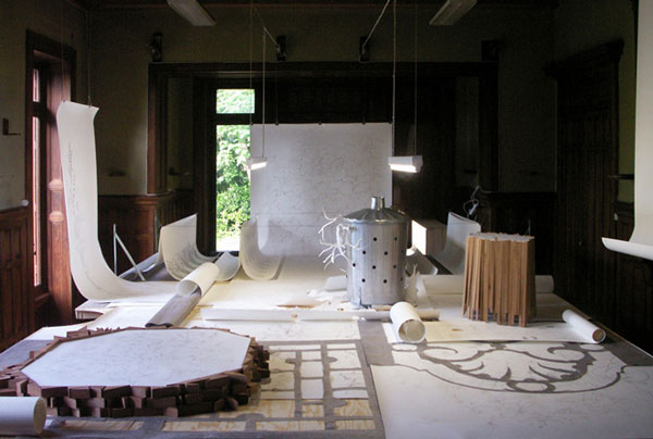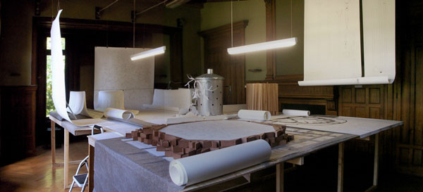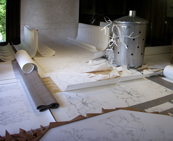 J'ai installé les dessins sur une table-estrade, d'une hauteur d'environ 1m30, qui formait une sorte d'îlot au centre de la pièce. Plutôt qu'essayer de suivre le plan d'organisation des dessins tel que décidé dans le protocole du projet, j'ai procédé de façon plus intuitive et organique. J'ai joué sur les recouvrements, superpositions, rencontres et trouées, de façon à recréer un petit paysage à la fois chaotique et organisé que l'on pouvait observer avec une certaine clarté perché sur un petit escabeau situé dans une encoche de la table. |