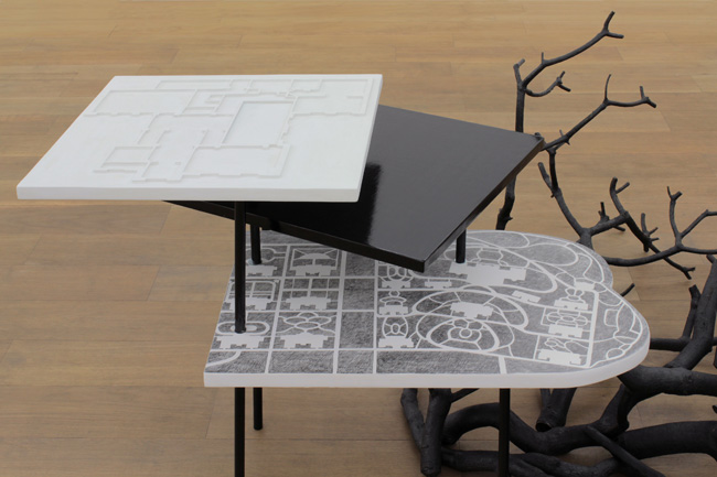 Sur une colline surplombant Vienne, l'architecte sécessionniste Otto Wagner a planifié une “ville blanche”. Cet ensemble de bâtiments regroupe le Steinhof et le Baumgartenhöhe, aujourd'hui l'hôpital Otto Wagner. C'est dans le pavillon dénommé Hermann, où étaient traitées les affections pulmonaires que Thomas Bernhard passa de longues semaines et dans le pavillon Ludwig que son ami Paul Wittgenstein fût interné à de nombreuses reprise pour sa folie. L'un malade du souffle et l'autre de la raison, Bernhard narre leur amitié dans Le neveu de Wittgenstein. En parenté avec ce récit, Pavillon Ludwig combine différents éléments organisés en strates. Au sol, se déploie un enchevêtrement de branches calcinées au milieu desquelles se trouve tapi un petit module de laiton compressant une bulle de caoutchouc. De cette simili-forêt, émerge un premier plateau portant le plan du complexe hospitalier dessiné par Otto Wagner, dont les chemins forment de gracieuses volutes entre les pavillons. Le niveau suivant est une surface noire, réfléchissante tout autant que close, point intermédiaire avant le dernier plateau, blanc, où affleure en léger relief le plan du rez-de-chaussée de la maison que Ludwig Wittgenstein dessina pour sa sœur à Vienne.