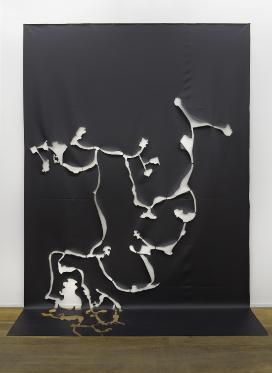 À proximité de Gortyne, en Crète, un ensemble de carrières exploitées depuis l’antiquité a été souvent considéré comme étant le Labyrinthe dans lequel Minos aurait enfermé le Minotaure (notamment par Sebastian Münster dans son ouvrage Cosmographia Universalis au XVI° siècle). Si le secret du mythe reste difficilement perçable, le dessin des grottes a, quant à lui, fait l’objet de plusieurs tentatives, plus ou moins achevées. À l’opposé d’un objet ou un territoire dont on pourrait embrasser les contours depuis un point de vue spécifique, on ne peut déterminer la forme et le plan d’une grotte qu’en la parcourant. Son dessin est donc le résultat d’un déplacement, celui d’un explorateur s’enfonçant dans le boyau qui perce la roche. Ce dessin sera donc ici « en réserve », découpé par silhouette dans la matière opaque et noire, les ciseaux avançant pour révéler les contours de ce lieu souterrain.