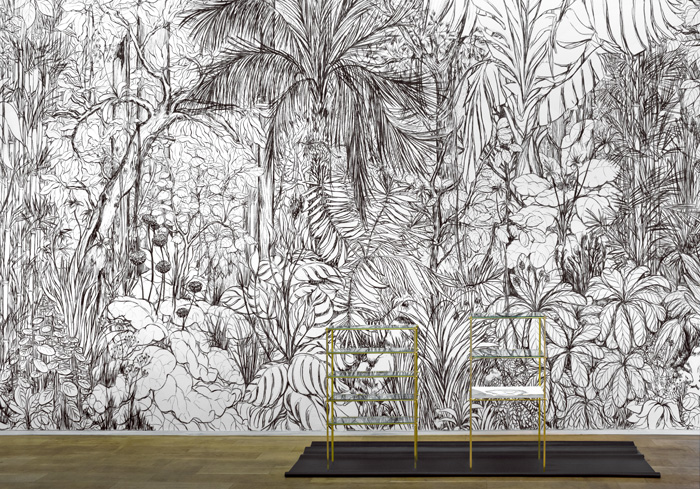 Jouant de l’idée de décor, la jungle habite le mur tout comme elle l’habille et le désigne, produisant un espace dans lequel le regard peut se perdre, mais qui reste néanmoins fondamentalement borné par les limites de l’architecture.