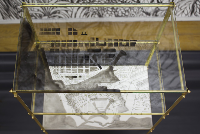 Réalisée pour la première présentation de La luxuriance sauvage de leurs ramifications au Musée d’Art Moderne de Saint Etienne, cette structure de laiton porte sur trois de ses plaques de verre les plans des duplex imbriqués de la Cité Radieuse dont Le Corbusier a construit une version à Firminy, à proximité de Saint Etienne. En contraste avec le fouillis de la forêt qui se reflète sur le verre, la rationalisation de la “machine à habiter” organise l’espace à vivre dans une efficacité ergonomique. Cette rigueur s’applique aussi au végétal dans les « étages » inférieur, où le vivant se trouve alors contraint dans les limites du strict dessin d’un jardin formel baroque. |