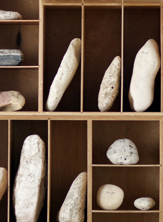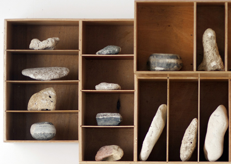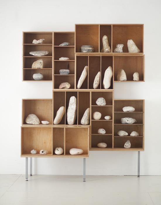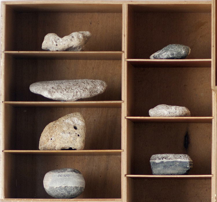 Cette bibliothèque est construite sur la base des aménagements de véhicule professionnel. Ici un peugeot partner. Les 2 modules habituellement disposés face à face sont ici empilés. A chacun des anniversaires des objets de la collection "tout ce que je vous ai volé", pour les 20 ans de leur disparition, je suis allé prélever une pierre que j'ai annotée de 1 à 36 suivi des initiales de chacun d'entre eux.