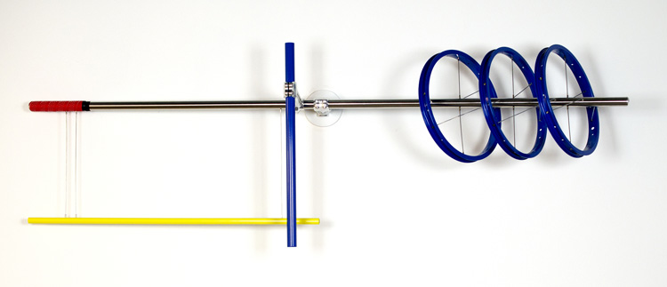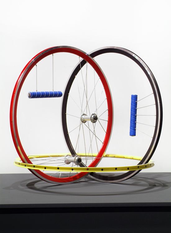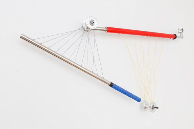 Cette série de sculpture murales, mêle aussi bien certains accessoires issus de l’univers du cyclisme que des références aux peintures abstraites de l’artiste Piet Mondrian.