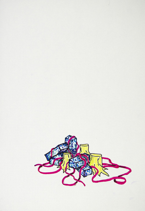 Issues d’un vocabulaire de formes et de matériaux différents, toutes ces sculptures seront, par un savant jeu de disposition, liées les unes aux autres et formeront un espace narratif. Un tas de parpaings en chêne massif s’éparpillent au sol tandis qu’une végétation, faite de tuyaux de cuivre, gagne progressivement ce semblant d’architecture. Au travers de cette hypothétique civilisation détruite, rongée progressivement par la nature, c’est bien la déchéance d’un monde avili par la contemporanéité que Rubble évoque. Un monde de faux semblant où les marbres sont devenus plâtres, les pierres précieuses du plastique, les ruines des parpaings. Une sorte de tragédie grecque où la dramaturgie sonne faux… Une nouvelle beauté contemporaine, qu’il vaut mieux ne pas déplorer mais plutôt apprendre à regarder…