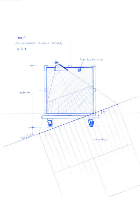 Sur les 5 faces visibles à l'intérieur d'un cube entièrement noir, sont dessinées des anamorphoses de formes topologiques.