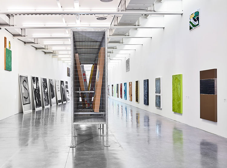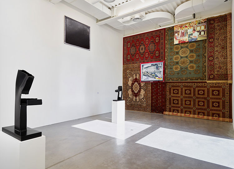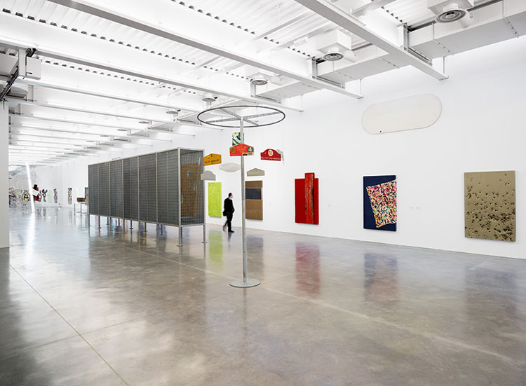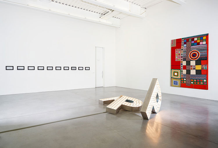 Cette traversée d’un moment de l’oeuvre de l’artiste rend sensible la dynamique créatrice d’une quête en mouvement constant et met au jour les ressorts qui l’animent. La recherche se révèle hyperactive, l’éclectisme de l’oeuvre en témoigne. Faisant feu de tout bois, l’artiste est un collectionneur invétéré d’objets trouvés et de matériaux hétéroclites – tissus imprimés, autocollants, fèves de galettes, tapis, lingettes de machine à laver. Qui plus est, des activités liées à des métiers divers, broderie, carrosserie, couture ou ferronnerie, participent de ses pièces, leur réalisation pouvant être déléguée à un tiers.