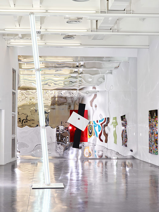 Verre extra-blanc, argenture, peinture métallisée, acier zingué, caoutchouc, 248 x 158 x 9 cm |