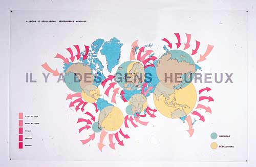 Dans le dessin la composition de cercles et de flèches colorés sur une carte du monde nous indique les flux d’illusions et de désillusions au niveau international. Ces différents flux comprennent les chimères, erreurs des sens, erreurs de l’esprit, mirages et autres duperies indiquant finalement de fatals déséquilibres mondiaux. Globalement, dans cette installation, est pointé, avec ironie et cynisme mais non sans tendresse, le caractère illusoire de notre perception du bonheur.
