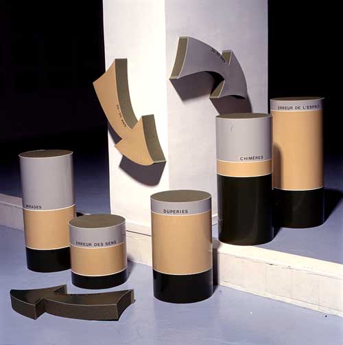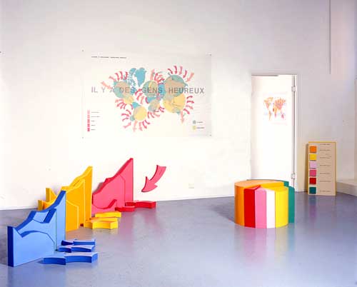 Il y a des gens heureux (Some people are happy) proposes an apriori scientific description of the conditions for happiness. Here, the methods of comparative analysis and statistics are applied to nothing quantifiable. Falsely objective calculations, insolent observations, and totally subjective data expose some reasons to be happy. In the drawing, the composition of colored arrows and circles indicates the flow of illusions and disillusions on an international level. The flows contain chimeras, sensory errrors, intellectual errors, mirages, and other tricks finally showing the fatal imbalance of the world. Overall, this installation points out, in an ironic and cynical -albeit tender- manner, the illusory nature of our perception of happiness.