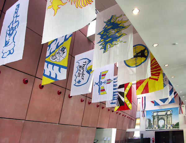 Seize drapeaux extraits de la collection Des Costumes Pour Marseille, réalisés en 1995 par les T-Birds, groupe de supporters de l'OM.