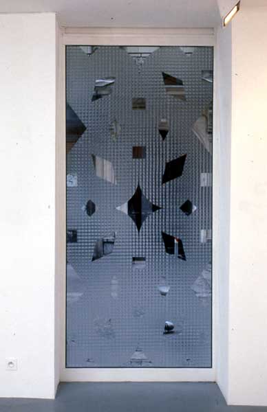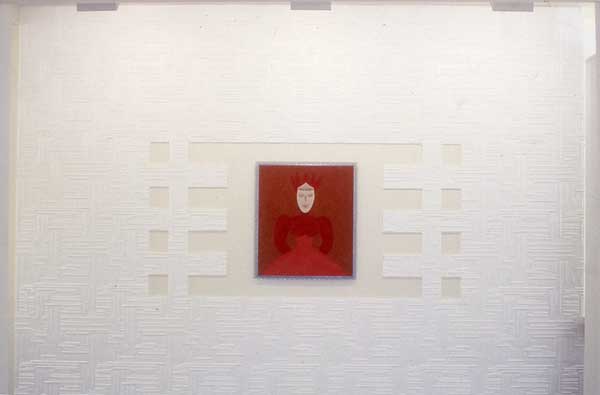 Reine, de Pascale Stauth se compose d’une silhouette stylisée de femme en feutrine, des clous dorés dessinent ses yeux, sa bouche, des clous d’argent sa couronne. Le tableau est encadré d’un treillis métallique. Claude Queyrel montre, quant à lui, des toiles d’un géométrisme abstrait parodique où la composition s’enferre piteusement dans le décoratif le plus flagrant. L’ensemble de la galerie est tapissé de plaques de polystyrène à motifs qui elles-mêmes, autour des œuvres, dessinent des figures décoratives d’un symétrisme volontairement naïf. L’idée était de relier, par le biais de ce ciment ornemental, les œuvres de ces deux jeunes artistes. Le stratagème peut d’ailleurs paraître superflu tant les directions empruntées par les deux artistes s’avèrent similaires. La légitimité d’une telle installation serait plutôt à chercher du côté d’une réflexion sur le kitsch et son environnement. Car si l’objet peut receler une valeur kitsch, fluctuante, cotée à la bourse aléatoire des modes, c’est dans les arrangements, les environnements que se révèle ce qui, à une époque donnée, s’apparente au mauvais goût. Le kitsch étant un système esthétique de communication de masse, s’en déduit une éthique de l’adaptation au plus grand nombre, théorisée par Pareto sous le nom d’“ophélimité”. Aussi le grand intérêt de cette double exposition résiderait-il dans une certaine approche du décoratif (cf. Le décoratif, J. Soulilou, Ed. Klincksieck) mettant en lumière ce truisme trop souvent occulté du kitsch comme phénomène non pas tant lié à la production industrielle d’objets qu’à leur consommation, à leur mise en place dans les intérieurs, au jeu auquel ils servent dans la comédie sociale du standing.