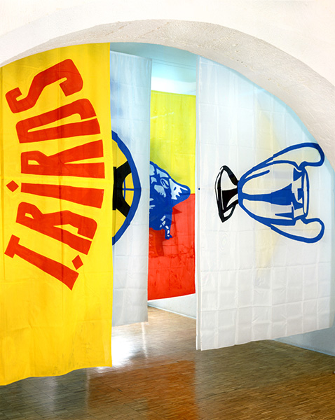 Santons tamponneurs de Philippe Guillotel (premier plan) et Drapeaux de Tom (fond)