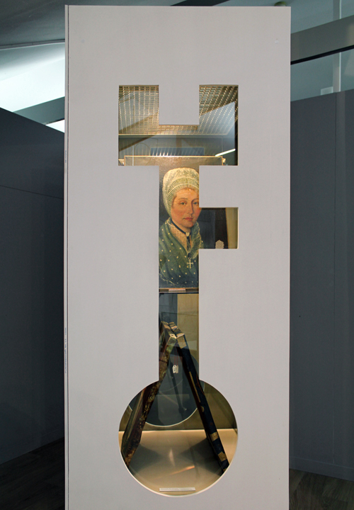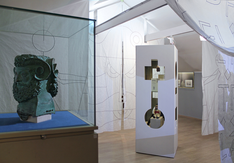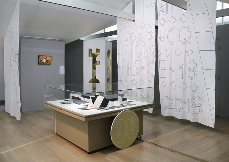 Vide, entièrement tournée vers l’extérieur, elle dialoguait avec le Mausolée du Duc de Lesdiguières, monument du XVIe siècle et résonnait avec un grand nombre d’autres objets, moins solennels, de la collection. Notre travail, comme la vie, est une sédimentation : de gestes, d’images, de récits multiples, qu’un environnement aussi riche ne pouvait que nourrir. De fil en aiguille, s’est tramée cette intrigue qu’est Siffler en travaillant, faite de bribes, d’interprétations d’œuvres qui nous accompagnent depuis longtemps ou de rencontres faites sur place… Nous y avons retrouvé les fantômes de Victor Brauner et sa femme, réfugiés non loin de Gap entre 1942 et 45, Hannah Höch, ses poupées et la Mechanischer Kopf de Raoul Hausmann qu’elle avait enfouie dans son jardin, Arp et Taueber ou le Facteur Cheval… Mais nous y avons aussi découvert ou redécouvert ces statuettes de bois, poupées Jacou du Queyras, les rosaces taillées au couteau des coffres familiaux, les animaux taxidermisés et bien d’autres encore. S’est alors construit avec et autour de quelques uns de ces personnages une architecture à la fois enveloppe et demeure, un décor constitué de rideaux brodés à traverser, de vitrines transformées en lanternes, de collections à voir par des trous de serrures…
