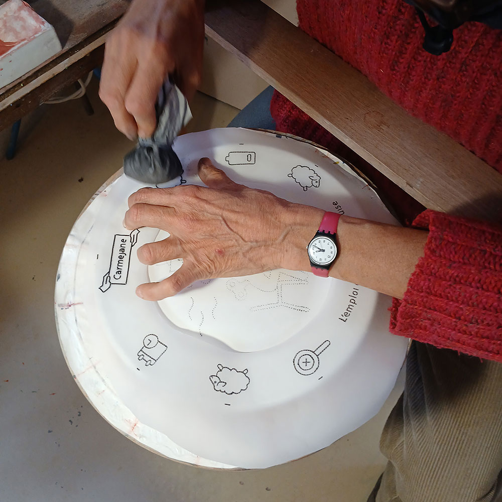 Nous avons réalisé, à partir de leurs doléances, un service d’assiettes dans l’atelier Bondil à Moustiers-Sainte-Marie, lors d’une résidence en entreprise de janvier à avril 2025. Les décorateurs de l’atelier ont également interprété une sélection de nos motifs en y apportant leur propre regard et leur savoir-faire.