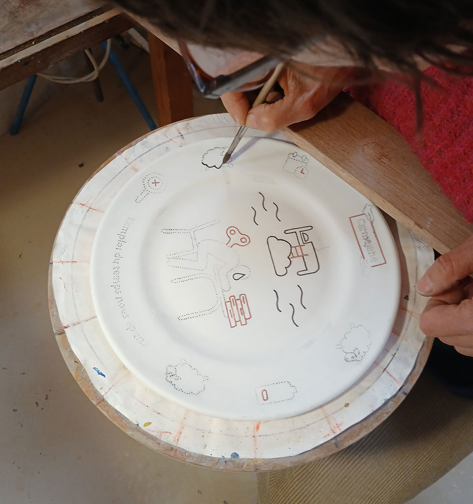 Son élaboration a débuté dans le cadre d’une résidence au lycée agricole Carmejane (04). Nous avons recueilli les souhaits et les revendications d’une classe de jeunes gens qui habitent ce territoire aujourd’hui et qui projettent d’y vivre demain. À partir de leurs conditions de vie et d’apprentissage, les élèves ont rédigé, en groupe, des doléances. Ils en ont ensuite expérimenté des traductions graphiques qui nous ont servi de modèles pour la création de ces « assiettes parlantes ».