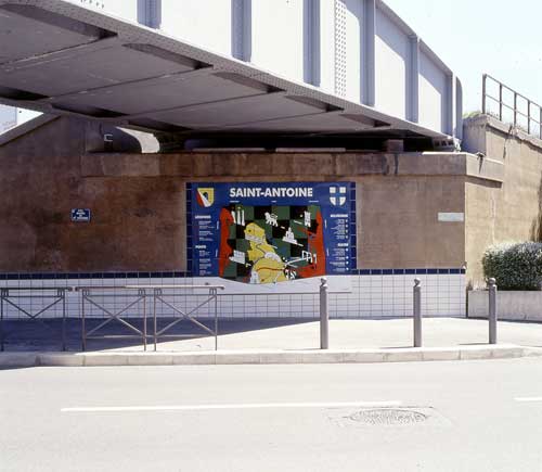 Ces deux panneaux émaillés, installés en vis à vis, de part et d'autre de la route, ont été créés par les pIasticiens Pascale Stauth et Claude Queyrel. Dans le cadre de la requalification artistique de ce pont, la ville de Marseille a choisi, après concours, ce projet de cartographie symbolique.