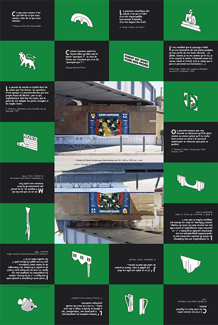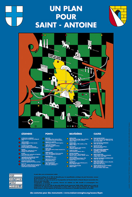 Sur un grand damier, qui alterne cases noires et cases vertes, le noyau villageois est signifié par la couleur jaune. Autour duquel, quatre types d'éléments servent de points de repères. Les légendes rappellent à la mémoire collective quelques épisodes historiques du quartier. Figurent aussi les ponts et les belvédères, y compris I’allée de l’Écume qui culmine sur le centre commercial Grand Littoral à quelques 115 m. Mais également les lieux de culte, de la pagode bouddhiste Phop Hoa à la première église arménienne de Marseille, Saint-Garabed.