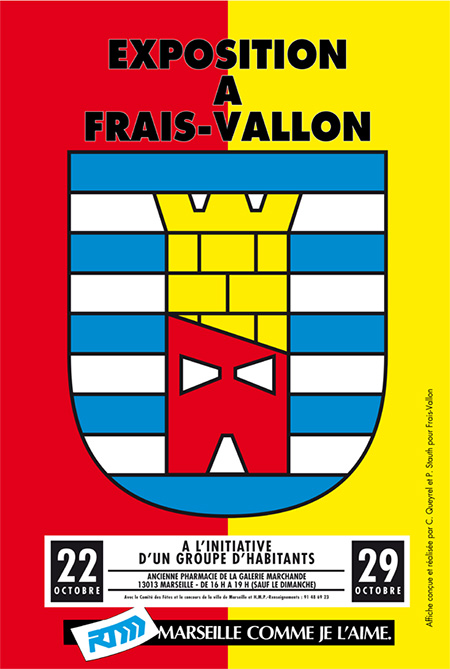 L’affiche de S&Q « Exposition à Frais Vallon » représente un blason imaginaire de Frais Vallon. C’est bien quelque chose comme ça qui flottait jadis sur les bannières sous lesquelles se rangeaient même les banlieues. Ce choix a aussitôt suscité une levée de boucliers comme « contraire à la recherche de banalisation de Frais Vallon » récemment décrétée. Tiens, encore une histoire de ban : vous avez dit banalisation ou banalité ? Décidément les artistes touchent juste ; l’espace public et ses symboles parlent clair et fort. Ils claironnent, et sinon aux oreilles de notre intelligence, directement à nos sens.