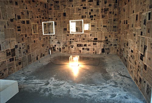 Glass, rock salt, halogen, cables, nylon wire, English, French, and German newspapers, Site-specific installation at the Portid gallery, Hafnafjördur, Iceland |