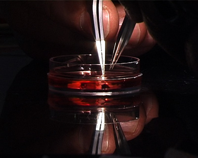La danse des pinces (dance of pliers) is a silent video concentrating on a close-up of a petri dish and a hand manipulating an undefinable organic mass in a red liquid with a pair of pliers. The movement is very slow, precise and graceful like a dance.