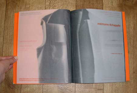 Objet sensible. Hors de contenance est un objet sensible. Cet ouvrage de Francine Zubeil souvre et se clôt par des photos de vêtements sur un cintre prises dans lappartement de la mère défunte de lartiste. En son centre, lobjet bascule sur une dizaine de pages et ce sont des lignes dimmeubles situés au cur de Manhattan, où Francine Zubeil a été en résidence de création, qui envahissent lespace de la page. Lensemble est imprimé en négatif sur papier transparent. Le regard traverse les images, si bien que la perception se résout en dehors de luvre elle-même.
