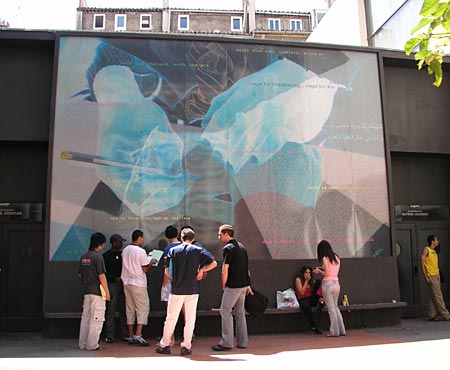 - une sérigraphie monumentale d’une image numérique 6,75 x 4m, et un banc de 6,75 m de long à l’intérieur d’un patio