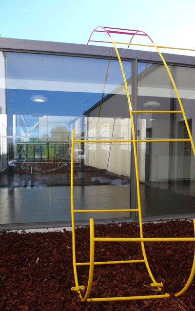 L'intervention artistique se situe dans un patio inaccessible traverssant l'école. La situation centrale de l'espace (entrée principale et passages vitrés de circulation) est soulignée par l'installation de deux pontons en bois(surélevés par des socles métalliques), offrant une circulation entre les ouvertures possibles d'un bout à l'autre de l'école et sur un autre axe.