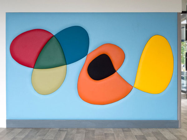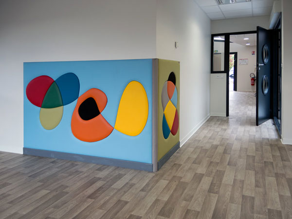 Une double cloison en angle, en matériau souple, est installée dans la pièce de vie à hauteur des petits enfants. Le tracé sur ces deux cloisons évoque un griboullis mural enfantin, et délimite des formes colorées qui sont autant de "pads" interactifs déclenchant des sons (parmi plus d'une centaine) selon une pseudo-logique déroutante. Les formes noires abritent les haut-parleurs. Par l'appui sur une des formes colorées, les enfants peuvent écouter un échantillonnage de paroles d'adultes de Livarot, impliqués ou non dans le projet du bâtiment. Tous se posent des questions ou expriment - de façon sérieuse ou cocasse - ce qu'ils envisagent indispensable pour le bien-être des petits usagers de ce nouveau bâtiment.