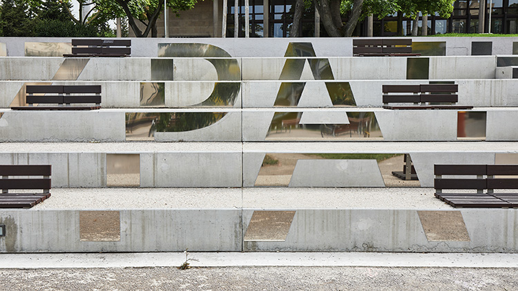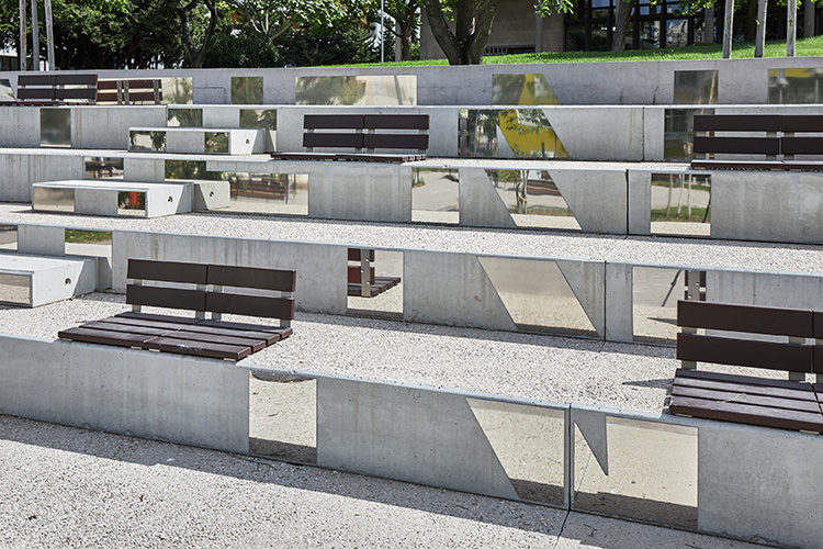 Je prends le parti d'utiliser les gradins de béton qui se trouvent face au bâtiment de Vezzoni et épousent le dénivelé qui mène au bâtiment principal conçu par René Egger. Ils deviennent le socle de l'oeuvre tout en conservant leur usage. L'oeuvre est palpable, à disposition.