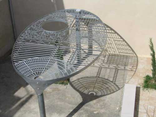 Kiosque, 2003 Ce projet, imaginé pour une place de la Ville de Valence, est de proposer d'y installer un objet hétéroclite, à la fois lieu de passage, de rendez-vous, de rencontre, sorte de kiosque ou de cage à lion.Devenant pour un soir (le soir du vernissage) 'bar à tapas', où des serveurs offriront à boire de l'intérieur vers l'extérieur, marquant ainsi la multiplicité de ses fonctions. Cette pièce est réalisée en fer forgé parce que la Ville de Valence est réputée pour sa ferronnerie d'art.J'aime, dans mon travail m'immerger dans un monde que je ne connais pas pour m'approprier de nouvelles pratiques qui deviennent miennes. Cet espace est une synthèse de plusieurs styles de ferronnerie d'art, de différentes époques et de différentes cultures.Il est à la fois fermé et ouvert, aérien et léger par les jeux graphiques de motifs décoratifs.Ceux-ci ont été choisis selon différentes procédures. J'en ai choisi certains dans des catalogues de ferronnerie industrielle.Avec les ferronniers d'art, nous avons créé d'autres motifs d'une façon tout-à-fait artisanale et d'autres encore ont été réalisés avec des moyens contemporains, tels que les découpes numériques au laser. Enfin, certaines parties ont été récupérées sur des bâtiments anciens. Ces motifs abstraits ou figuratifs ont été répartis à la manière d'un patchwork hétéroclite, où chacun des 12 panneaux de 350 x 200 cm a sa propre autonomie et où l'unité se réalise dans la totalité de par l'ensemble de ces panneaux qui se répondent les uns aux autres, composant ainsi un espace, un lieu, ce kiosque ou cette cage à lion, un prototype. Il joue avec la transparence, créant des jeux de lumière.Des ombres portées aux tonalités et au graphisme changeant se dessineront sur le sol.J'aime à penser que la ville, ses habitants, s'approprieront cet espace et le feront vivre.