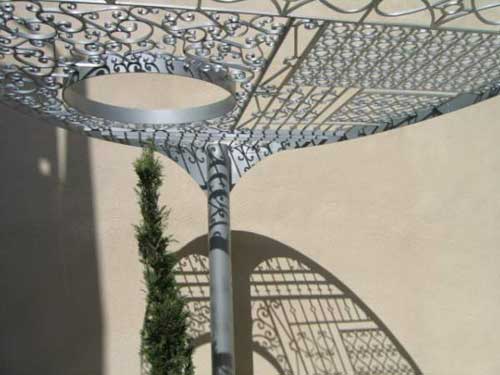 Les différents styles de ferronnerie de l'abri joue aussi de cette harmonie.Celle-ci pourrait être amplifiée par la pose d'une structure en verre sur la toiture.Au-delà d'un effet plus intime, et d'une certaine protection ainsi offerte (au vent, à la pluie...), le verre pourra provoquer différents jeux lumineux, différentes intensités ou reflets en jouant avec les couleurs et les transparences.