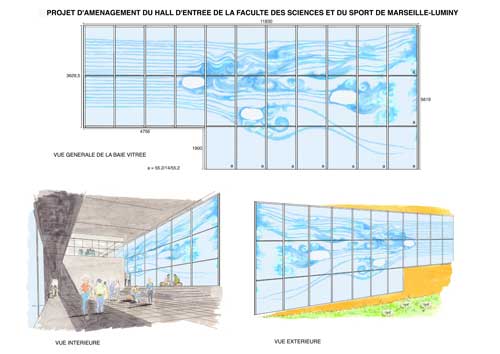 Répondant au plus près à la précision du cahier des charges, mon projet pour la Faculté des Sciences du Sport de Marseille-Luminy consiste en une intervention située essentiellement sur les parois vitrées du hall est.