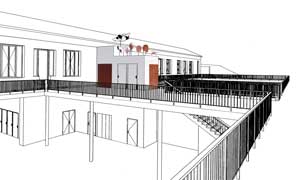 Les formes utilisées, en grande partie circulaires, ainsi que le matériaux font écho à certains détails architecturaux qui ponctuent avec élégance le bâtiment initial. Elles répondent aux ferronneries, aux cercles qui soutiennent la verrière.