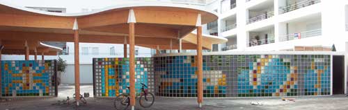 La frontière que constitue le mur de séparation entre les deux cours (maternelle et primaire) est envisagé comme une surface de projection propre à recevoir des interprétations variables. En effet, entre « la cour des grands » et celle des petits, l'écran que constitue un mur est propice aux fictions. Que ce soit projection vers le futur ou retour dans son passé, l'autre côté du mur est toujours fantasmé. C'est souvent le brouhaha sonore qui laisse deviner plus qu'il ne raconte l'existence de cet autre côté, cette autre dimension. Ici, la proposition est de laisser aussi entrevoir ces silhouettes en mouvement que sont les autres, à travers un lexique de formes déclinées en pavés de verre colorés. Le dessin y est construit sur le principe du point de croix. Les motifs y sont simplifiés jusqu'à en être quelquefois des indices plus que des images.