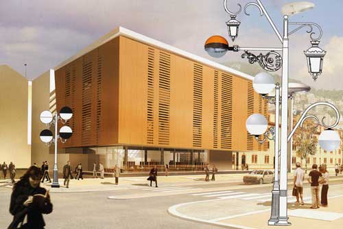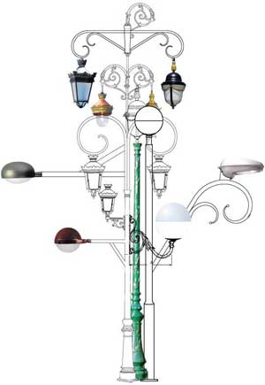 LES REVERBERES Quelques réverbères, tels que ceux décrits pour le site du Jardin, seront dessinés pour être implantés le long du mail. Ils seront répartis, tout comme les chênes et les pins de façon progressive, jusqu'à l'entrée sur le site où là, ils seront plus nombreux.