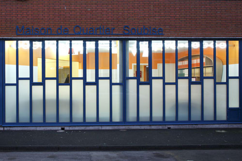 La proposition qui m'a été offerte de créer un projet pour cette maison de quartier, m'a orienté à développer une pensée plutôt globale pour l'espace du lieu. C'est-à-dire réfléchir simultanément à la question d'un signe fort ; un éclairage qui soit en même temps signe et oeuvre, faire du « nettoyage visuel » dans l'espace, c'est-à-dire faire de la place. Egalement produire un nouveau mobilier simple et cohérent. Enfin prendre en compte la circulation et ses rites liés aux différents usages que propose cette maison de quartier. Le fait de reconsidérer globalement l'éclairage, autant comme un signe identifiable que comme un apport de lumière, posait tout de suite la question de la cohérence intérieure et extérieure qui permettrait une lisibilité et une identité évidente de ce lieu.