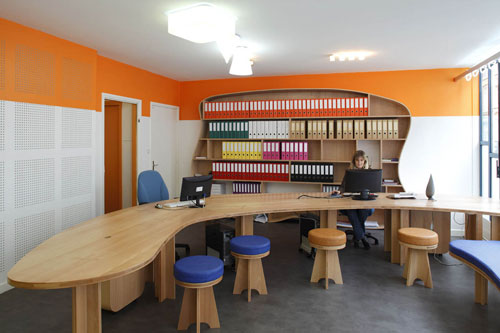 Le mobilier est lui, de construction simple et visible en éléments de contreplaqué 3 plis en hêtre de belle qualité, à l'usage de ceux et celles qui travaillent dans ce lieu ; et aussi à l'usage de ceux et celles qui y sont accueillis. J'ai voulu un mobilier chaud et enrobant et qui laisse une certaine fluidité à l'espace. P. Carré.