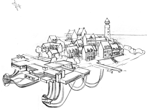 Point d'origine de cette représentation, à droite de l'image, un petit village breton dominé par un phare. Posé face à l'océan, à l'extrémité d'une langue de terre, il semble aux confins du monde, presque détaché de celui-ci. Sur sa gauche, l'édifice moderne de l'école, s'imbrique sous le bâti vernaculaire tel un socle. Il constitue un point d'attache et de liaison, l'articulation avec le reste de l'image qui se déploie sur la partie gauche du dessin.