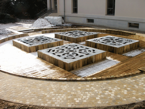 Partitions pour contraintes was commissioned by the region Rhône-Alpes for the patio of the horticultural lycée of Dardilly near Lyon. Four planters are covered with cutout metal sheets. The cutout shapes derive from 17th Century European gardens plans. Scaled down to the size of the planters, the layout become decorative shapes, the size emphasizing their ornamental aspect. Layed on planters, the metal sheets become stencils for the plants that will grow underneath them. The project is participative: each year, a group of student will devise a planting scheme, playing with the shapes provided for the plants to rise, the geometric constraint offering infinite possibilities for an ever renewed game.