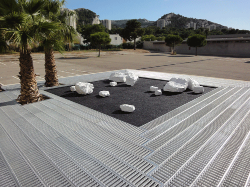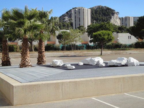 A la fois minéral, végétal et urbain ce projet d'espace sculptural hybride»permet un dialogue entre les paysages sauvages des calanques marseillaises présentes aux abords du bâtiment et une nature apprivoisée ou reformulée artificiellement dans le collège.