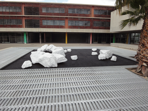 Formellement l'oeuvre reprend les codes esthétiques des jardins de pierres, fait de gravier noir appliqué avec un liant pour figer la structure du ratissage et d'enrochement de pierres blanches. Sorte de jardin minéral en plein coeur de la cour, le projet se présente comme le prolongement d'une oeuvre déjà existante dans mon travail ( «not so zen garden» 2007). Ce jardin «japonais» reformulé en résine et gravier ratissé était une oeuvre destinée à l'espace des Galeries et mon ambition était alors de trouver une alternative afin de créer son pendant pour l' extérieur. Ici donc, l' oeuvre est un espace ou les collégiens ont accès à l'ensemble du périmètre de la pièce qui comprend des «endroits» de natures et de matériologies différentes, tous pénétrables , occupables et qu'ils peuvent s'approprier à leur guise. En effet cette «sculpture/jardin» est occupée par différents éléments plastiques, reprenant tous des éléments de l'architecture présente, du paysage environnant ou de l'espace urbain alentour. En lien direct avec l'architecture du collège, la déambulation autour de l'espace ratissé, est composée des mêmes structures que celles servant de parements muraux au hall d'entrée du rez-de-chaussée du collège, de type plancher métallique «diamond robust» en tôle galvanisée.