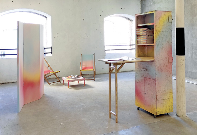 | Diego Guglieri Don Vito, L’assemblée heureuse, commence à se frôler, 2022 Dimensions variables, œuvre / dispositif, caisse de transport, paravent, chaises longues, table basse, peinture acrylique pulvérisée Crédit photo : Diego Guglieri Don Vito |